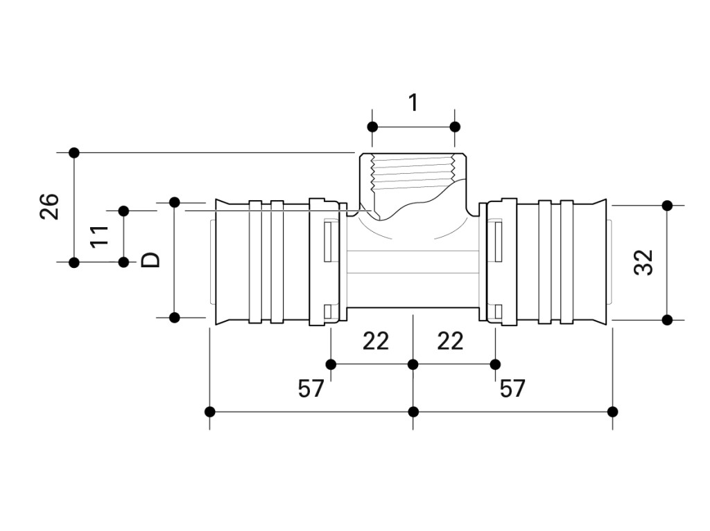 Female thread tee adapter according to DIN EN 10226-1 made of dezincification-resistant brass for drinking water and heating system installations featuring white fixation rings with integrated inspection holes, fixed stainless steel pressing sleeves and leak function. Pressable with pressing contours F and TH.