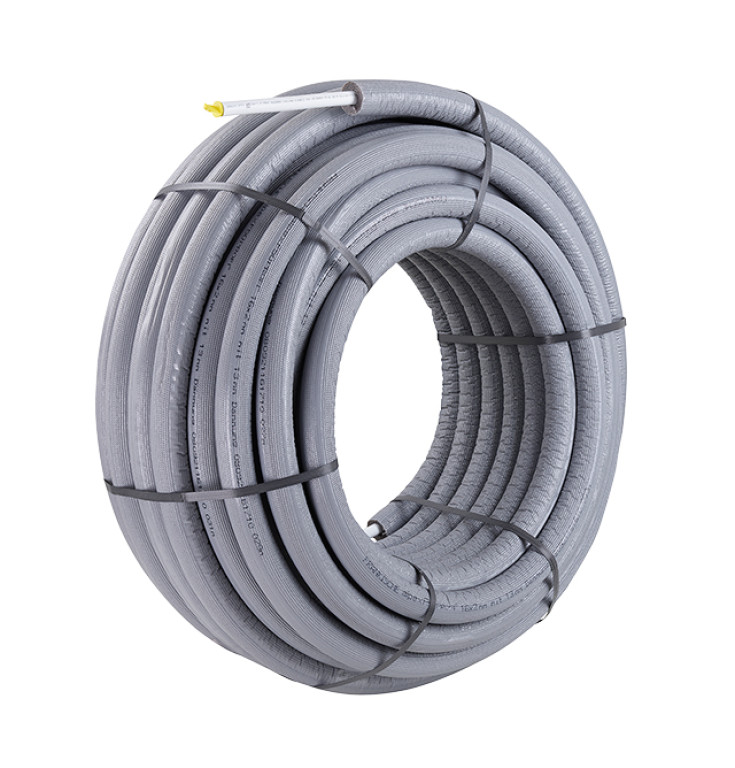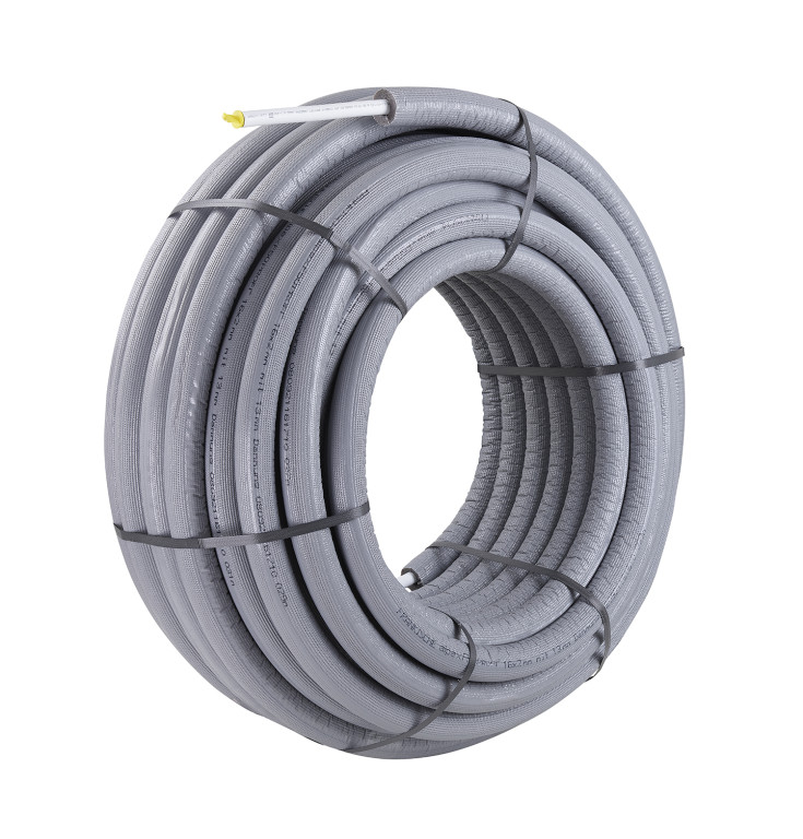 Multilayer composite pipe, colour: white, in coils made of cross-linked polyethylene (PE-Xb) as inner surface, longitudinally butt-welded aluminium pipe, and polyethylene of raised temperature resistance (PE-RT) as outer surface for drinking water and heating system installations, wrapped in pipe insulation made of flexible closed-cell PE foam with thermal conductivity group 040.